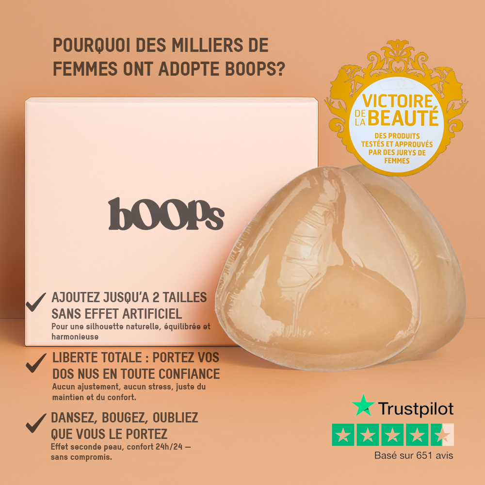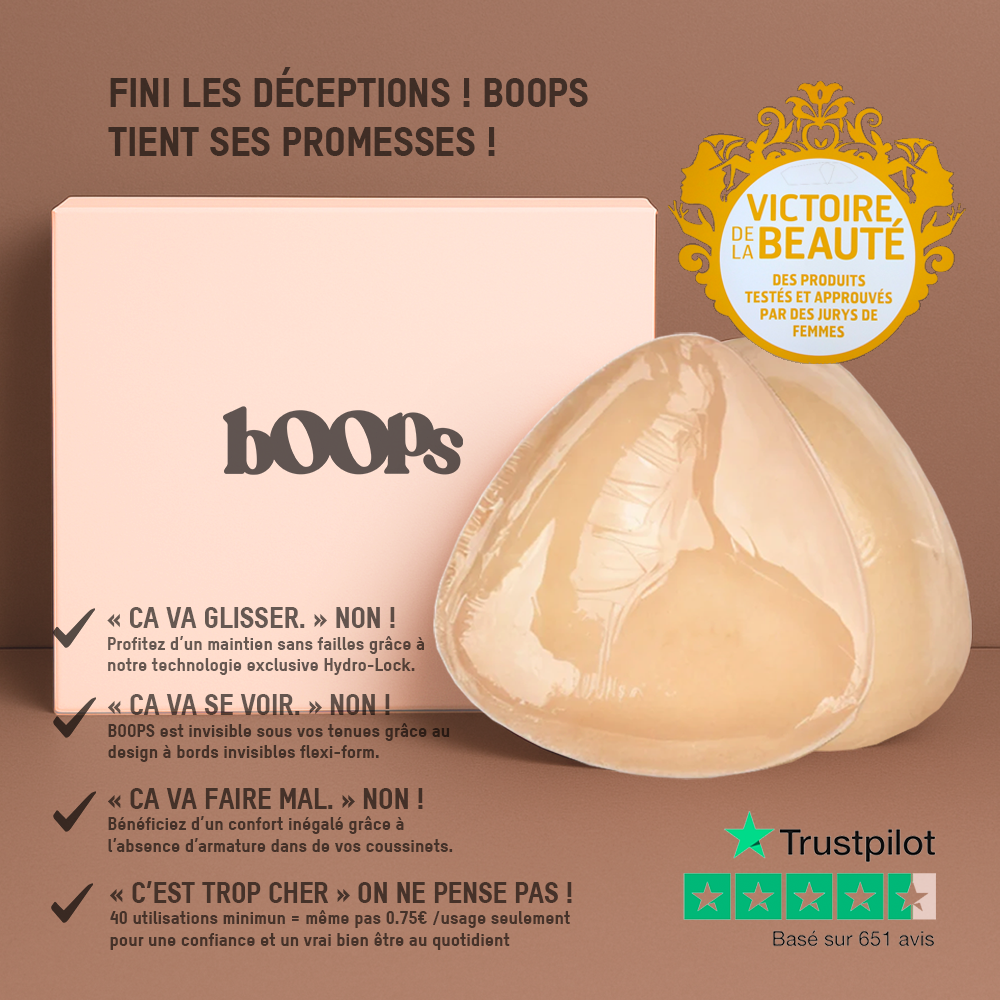 Nous soutenons notre produit avec une confiance absolue. Si vos Boops ne fournissent pas le rehaussement, le confort et la tenue que nous promettons, nous vous rembourserons votre achat – sans poser de questions.