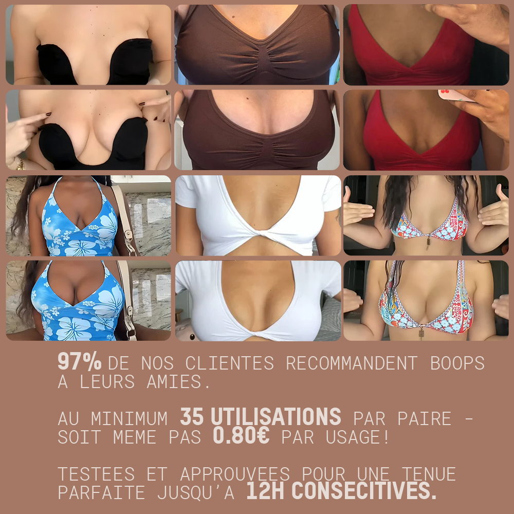 Avec un entretien approprié, bOOps maintient sa qualité adhésive pendant plus de 40 utilisations. C'est des semaines de rehaussement confiant à partir d'une seule paire !